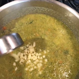Turn off the heat. Use the hand blender to puree the soup. If you are doing this in a blender you will need to do it small batches. Be very careful because if the soup splatters it will be hot.
