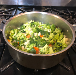 Add the oil, carrots, onions, celery, salt, and pepper to a large pot. Saute for about 10 minutes without browning. Add the garlic and stir until fragrant; about 30 seconds to a minute. Add the potatoes, broccoli, and the broth. Simmer until the vegetables are very soft. This should take about 10-12 minutes.