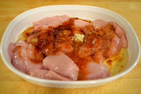 Combine the chicken, garlic, oil, lime juice, cumin, chipotle powder, chili powder, 1/2 teaspoon salt, and smoked paprika. Let rest while cooking the vegetables.