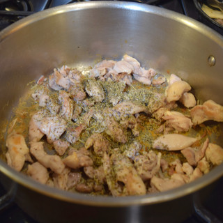 In a large pot, heat the oil. Add the chicken and saute. Once golden, add the wine and simmer a minute. Then add the seasonings, diced tomatoes, and broth. Stir in the beans.