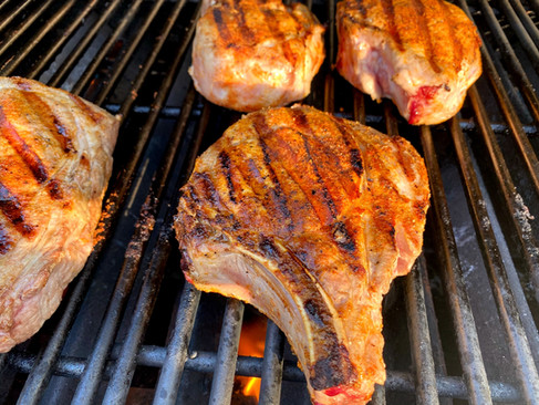 Coat a grill with cooking spray. Once heated, add the chops. Cook on one side until there are good grill marks. Flip and continue cooking. Flip again, crisscrossing the grill marks. These thick chops will take a little time to cook. When tested with an Instant-Read Thermometer at 136 degrees - 138 degrees, they are ready. Let rest for about 5-10 minutes before serving.
