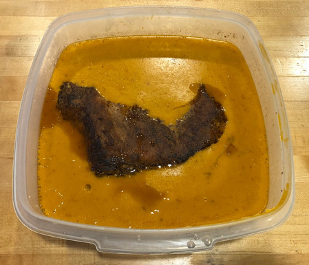 When the meat is tender, please remove it from the oven. Place the meat in a plastic container. Discard the onions and the herbs. Strain all of the liquid into the container with the beef; refrigerate overnight.