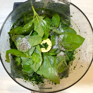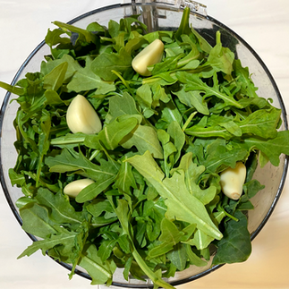 Add the kale, arugula, and garlic to a food processor. Pulse until the mixture is coarse. You might have to stir it to get things moving. Once chopped, add the cheese and pignoli nuts and pulse a little more.