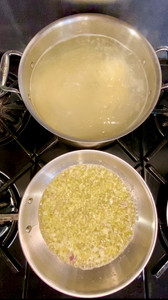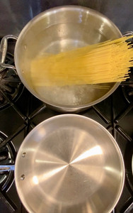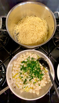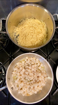 Transfer the scallop mixture to the pot of linguine. Gently toss the scallops with the pasta and add a little cooking water to loosen up the mixture. You will not need all of the water.