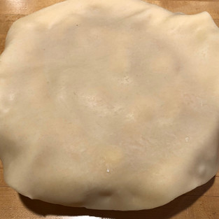 Roll out the pie crust to roughly 13-14 inches in diameter. Once the bottom crust is rolled out place the rolling pin at the end of the dough which is closest to you. Carefully, roll the the pin forward to wrap the dough around the pin. Lift the pin over the pie plate and gently unroll the dough . The pie dough will land on top of the pie dish. Gently press it into the plate. Trim the scraggly edges leaving about an inch to an inch and a half to overhang.