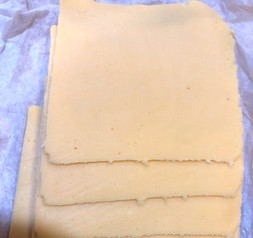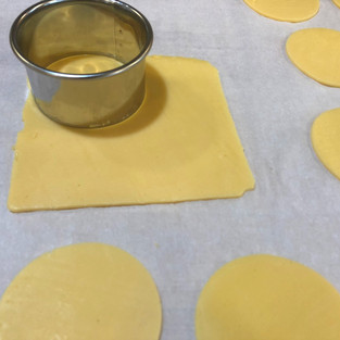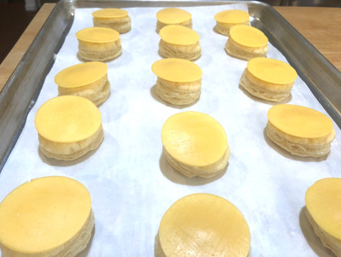 While the rounds are baking it's a good time to cut the cheese. Using the slightly smaller ring cut out as many pieces of cheese as you have puff pastry rounds. I was able to get two circles from each piece of cheese. I saved the scraps in a baggie. I'll use them in scrambled eggs, for grilled cheese, or burgers.