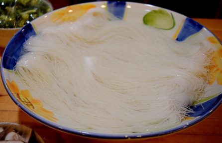 Place the noodles in a large bowl. Completely cover them with hot water. Let the noodles rest until softened, about 10 minutes. Once tender, drain and cut them in half; set aside.