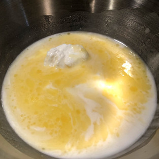 In another medium-sized bowl, combine the buttermilk, yogurt, and melted butter; add the eggs.