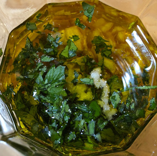 To make the dressing in a small jar combine the olive oil, orange juice, red wine vinegar, shallot, minced garlic, anchovy paste, chopped parsley, and season with salt and pepper. Put the lid on the jar and give it a good shake. If you don't have a jar the dressing ingredients can be combined in a small bowl. Set aside.