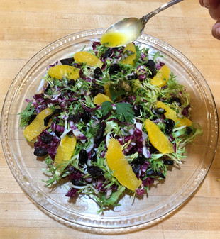 Combine the radicchio and frisée in a bowl or a platter. Top with the orange supremes and olives. Give the dressing another shake and drizzle some on the salad. You might have a little extra. Season the salad with salt and pepper.