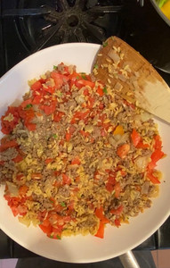 Saute the chopped onion with 2 tablespoons of oil. Add the beef and cook until no longer pink.