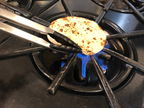 I like to heat and char up the tortillas. It really makes such a difference in taste and texture. I do this by holding it over the flame on my stove. If you do not have a gas stove you can heat the tortillas in the oven. Just wrap them in foil. Once the tortillas are ready the fajitas can be assembled.