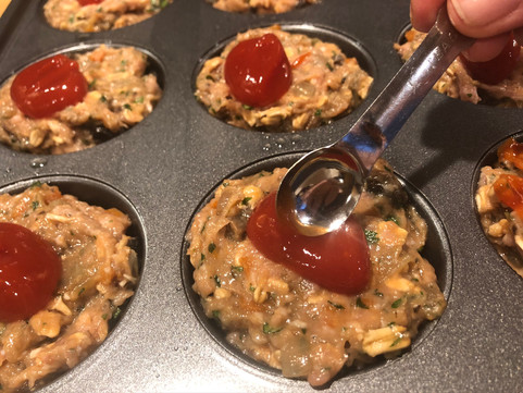 Coat the pans with cooking spray, then fill each cup with the meat mixture, dividing equally. Then take the 1/2 cup of ketchup and evenly spread about a teaspoon over each loaf. Transfer the meat to a preheated 350-degree oven and bake for 18-20 minutes.