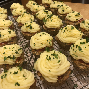 Once cooked, remove the cupcakes from the pans and place them on a rack or sheet pan. Pipe or spoon the potatoes onto each one and sprinkle with parsley.