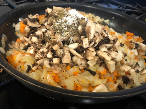 Add the oil, onions, and carrots to a pan and season with salt and pepper. Cook for a few minutes, and when the vegetables start to tender, add the mushrooms, oregano, thyme and season with more salt and pepper. Continue cooking until the mushroom juices mostly evaporate. Set the vegetables aside and completely cool.